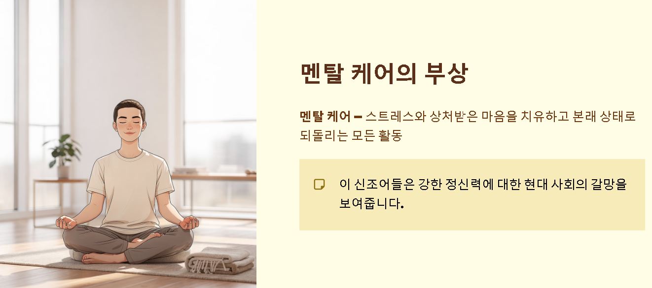 - 멘탈 케어: 스트레스나 상처받은 마음을 치유하고 본래의 상태로 되돌리려는 모든 활동을 뜻합니다.