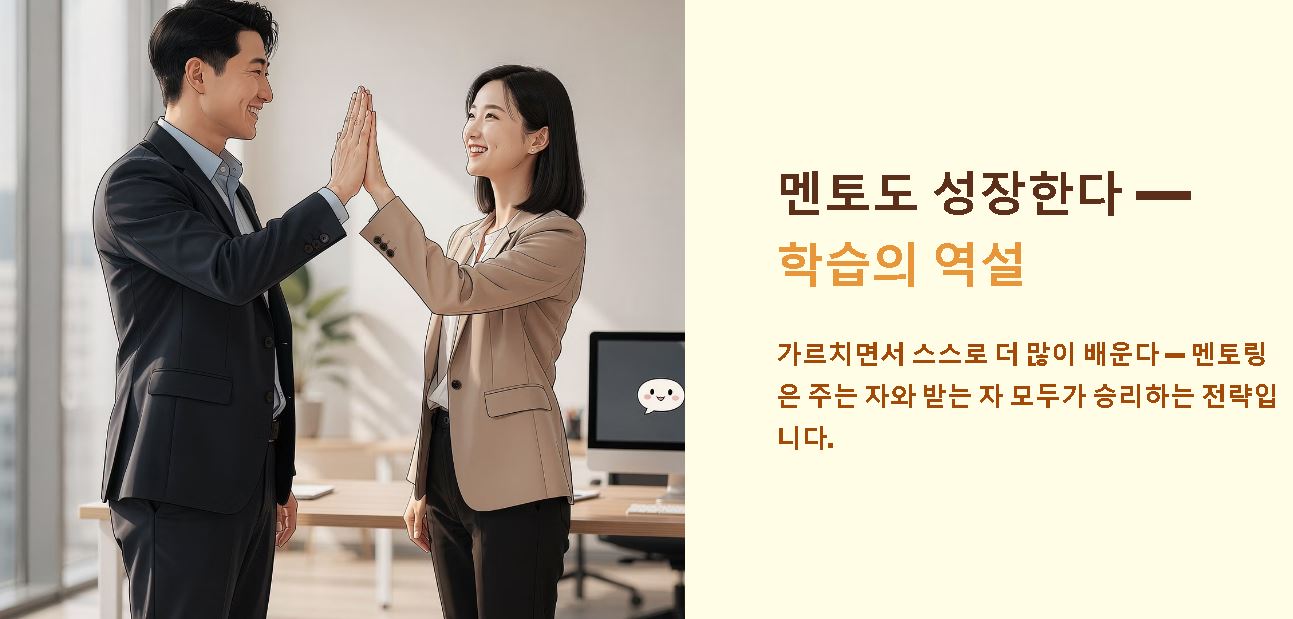 흥미롭게도 멘토링은 멘티뿐만 아니라 멘토에게도 커다란 성장의 기회를 제공합니다. 가르치면서 스스로 더 많이 배운다는 '학습의 역설'이 발생하는 것인데요. 자신의 노하우를 정리하여 전달하는 과정에서 전문성이 더욱 정교해지며, 멘티의 신선한 시각을 통해 매너리즘에서 벗어날 수 있는 혁신적인 아이디어를 얻기도 합니다.