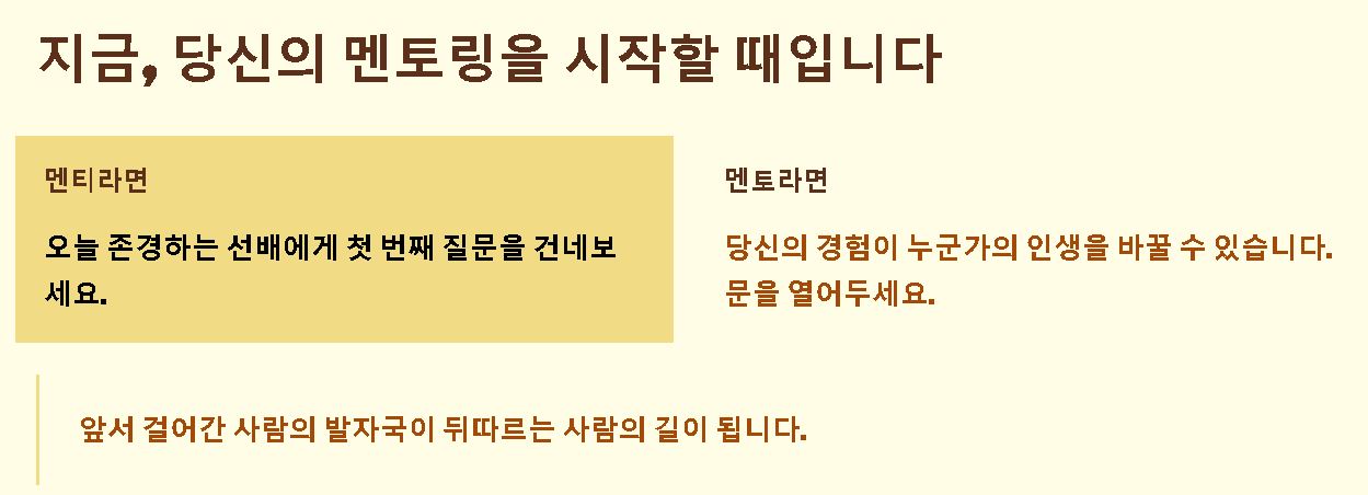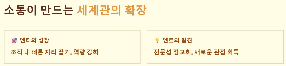 - 네트워크의 확장: 멘토는 자신이 구축한 인적 자산을 멘티에게 소개함으로써, 멘티가 더 넓은 세상으로 나아갈 수 있는 교두보 역할을 수행합니다.