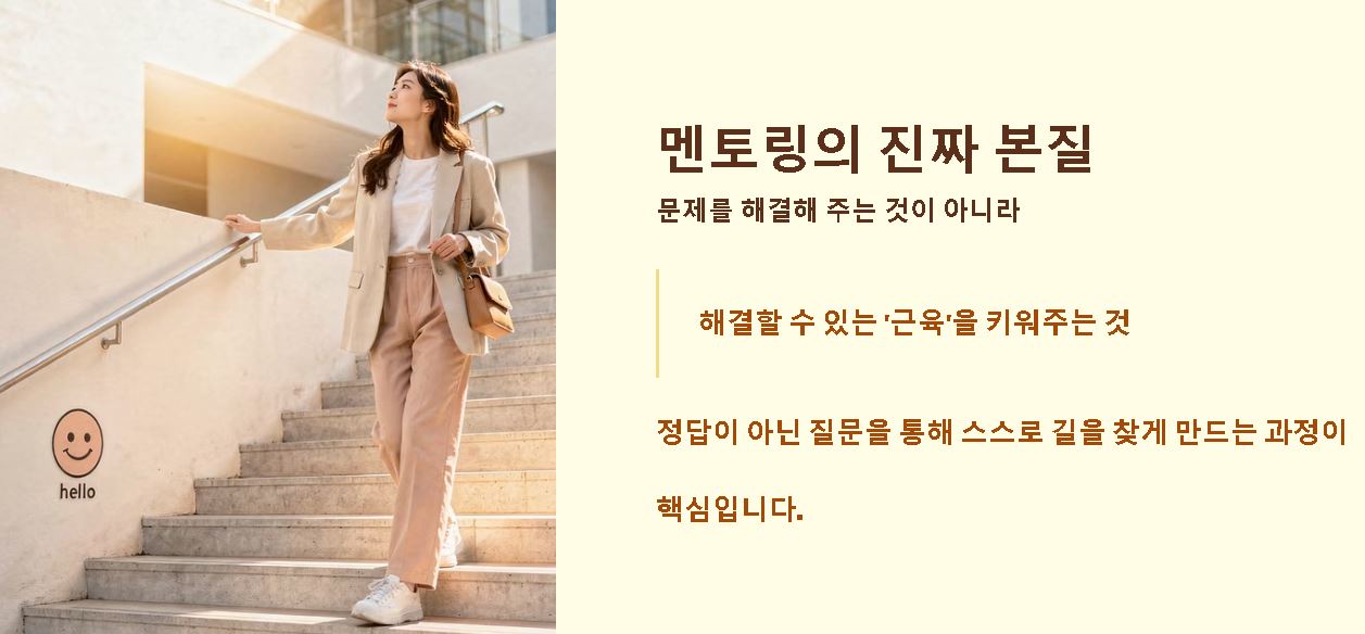 - 명확한 목표 설정: 단순한 친목을 넘어 멘티가 도달하고자 하는 구체적인 성장 지표를 공유해야 관계의 효율성이 높아집니다.