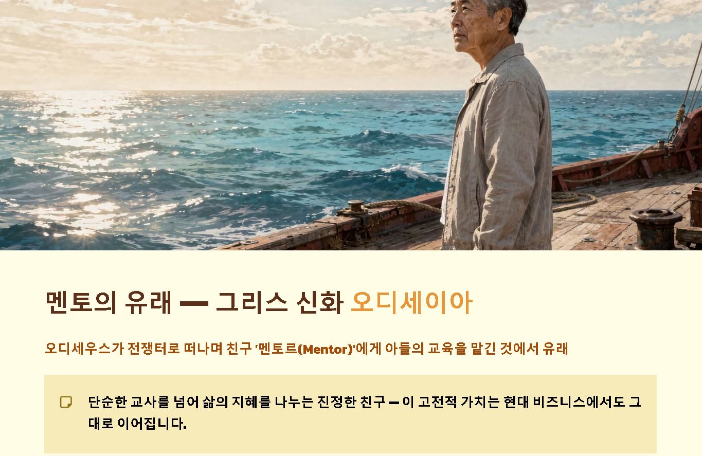 요약: 신화에서 시작된 지혜의 공유는 오늘날 가장 세련된 인재 육성 방식으로 자리 잡았으며, 인간적인 유대가 중심이 될 때 그 가치는 극대화됩니다.