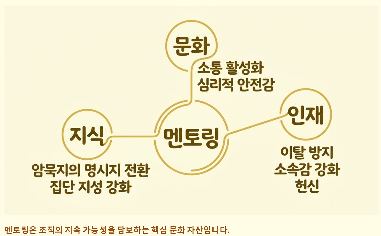 - 무형 자산의 공식화: 베테랑의 머릿속에만 있던 암묵지가 멘토링을 통해 명시지로 전환되며 조직 전체의 지적 역량이 강화됩니다.