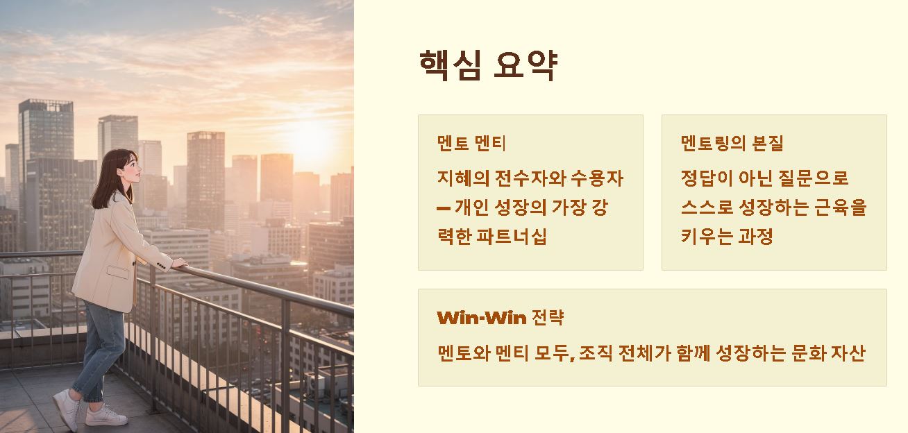 요약: 멘토링은 주는 자와 받는 자 모두가 승리하는 윈윈(Win-Win) 전략이며, 조직의 지속 가능성을 담보하는 핵심적인 문화 자산입니다.