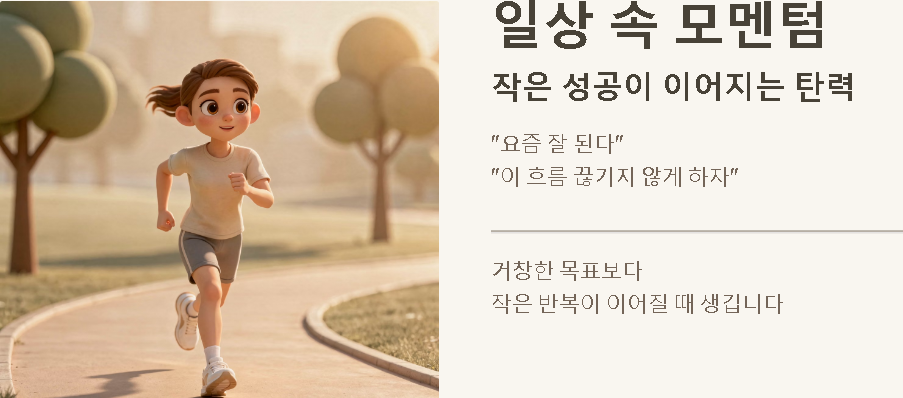 일상에서 모멘텀은 “요즘 잘 된다”, “이 흐름 끊기지 않게 하자”처럼 말할 때 자주 써요. 여기서 사람들이 많이 착각하는 건 모멘텀을 ‘큰 결심’으로 만들려는 거예요. 생활 속 모멘텀은 거창한 목표보다, 작은 반복이 이어질 때 붙는 경우가 더 많습니다. 예를 들어 운동을 3일 연속했거나, 집안일을 하루 10분씩 꾸준히 했을 때 “탄력이 붙었다”라고 느끼는 게 모멘텀이죠.