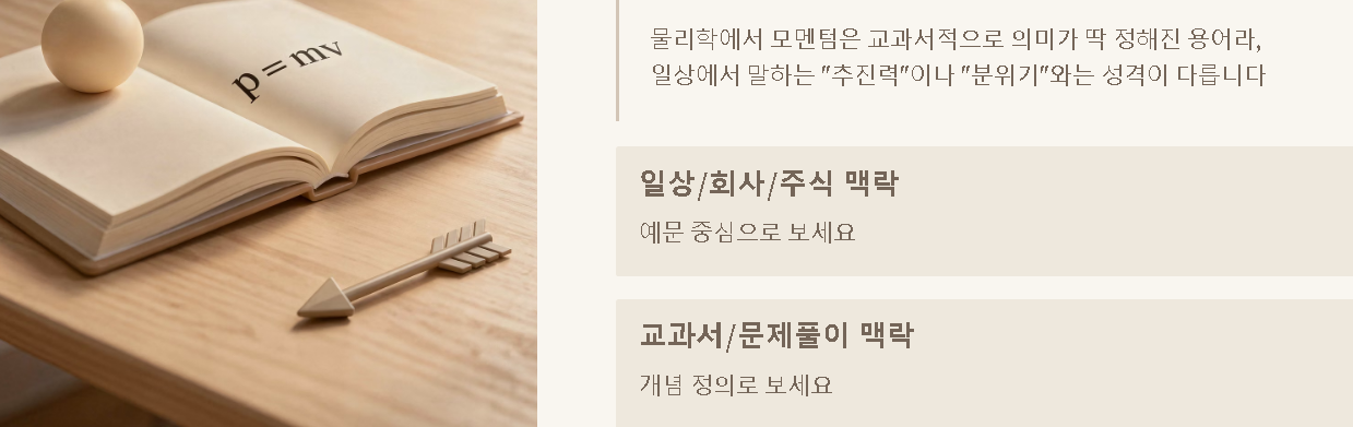 모멘텀을 찾아보면 물리학 설명이 같이 나와서 더 복잡해지는 경우가 많아요. 물리학에서 모멘텀은 교과서적으로 의미가 딱 정해진 용어라, 일상에서 말하는 “추진력”이나 “분위기”와는 성격이 다릅니다. 그래서 검색할 때도 내가 찾는 뜻이 일상용인지, 경제용인지, 교과서용인지부터 정하면 설명이 섞이지 않아요.