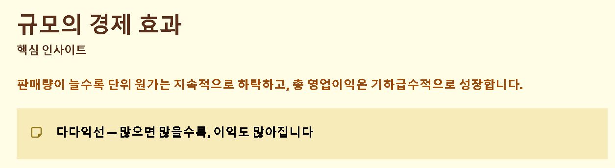 - 생산 단가 하락: 판매량이 다다익선이 될수록 제조 원가는 낮아지고 영업 이익은 반비례하여 상승합니다.