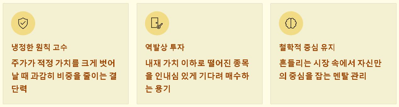 - 역발상 투자: 시장의 소외를 받아 내재 가치 이하로 떨어진 종목을 인내심 있게 기다려 매수하는 용기가 수익을 만듭니다.