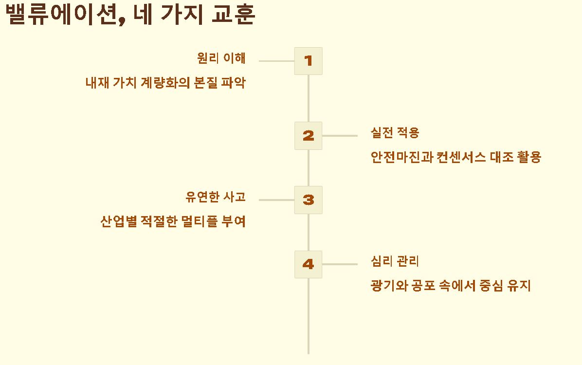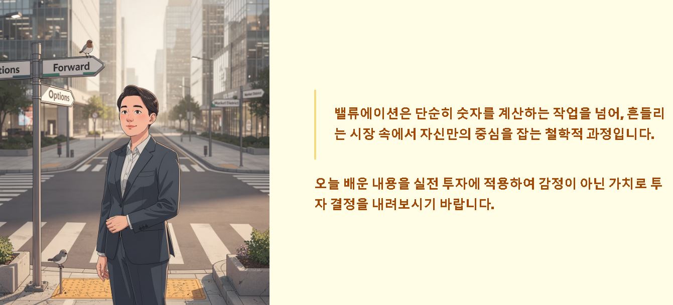 요약: 밸류에이션은 단순히 숫자를 계산하는 작업을 넘어, 흔들리는 시장 속에서 자신만의 중심을 잡는 철학적 과정이기도 합니다.