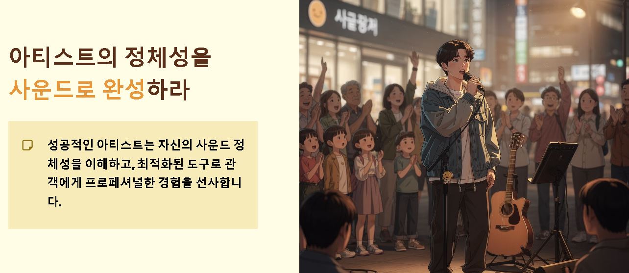 요약: 성공적인 아티스트는 자신의 사운드 정체성을 이해하고 그에 최적화된 도구를 활용하여 관객에게 프로페셔널한 경험을 제공합니다.