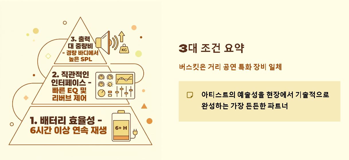 - 무게 대비 성능(Output-to-Weight): 아티스트 혼자서도 운반 가능한 가벼운 무게를 유지하면서도, 트인 공간에서 소리가 흩어지지 않게 쏘아주는 높은 음압(SPL)이 필요합니다.