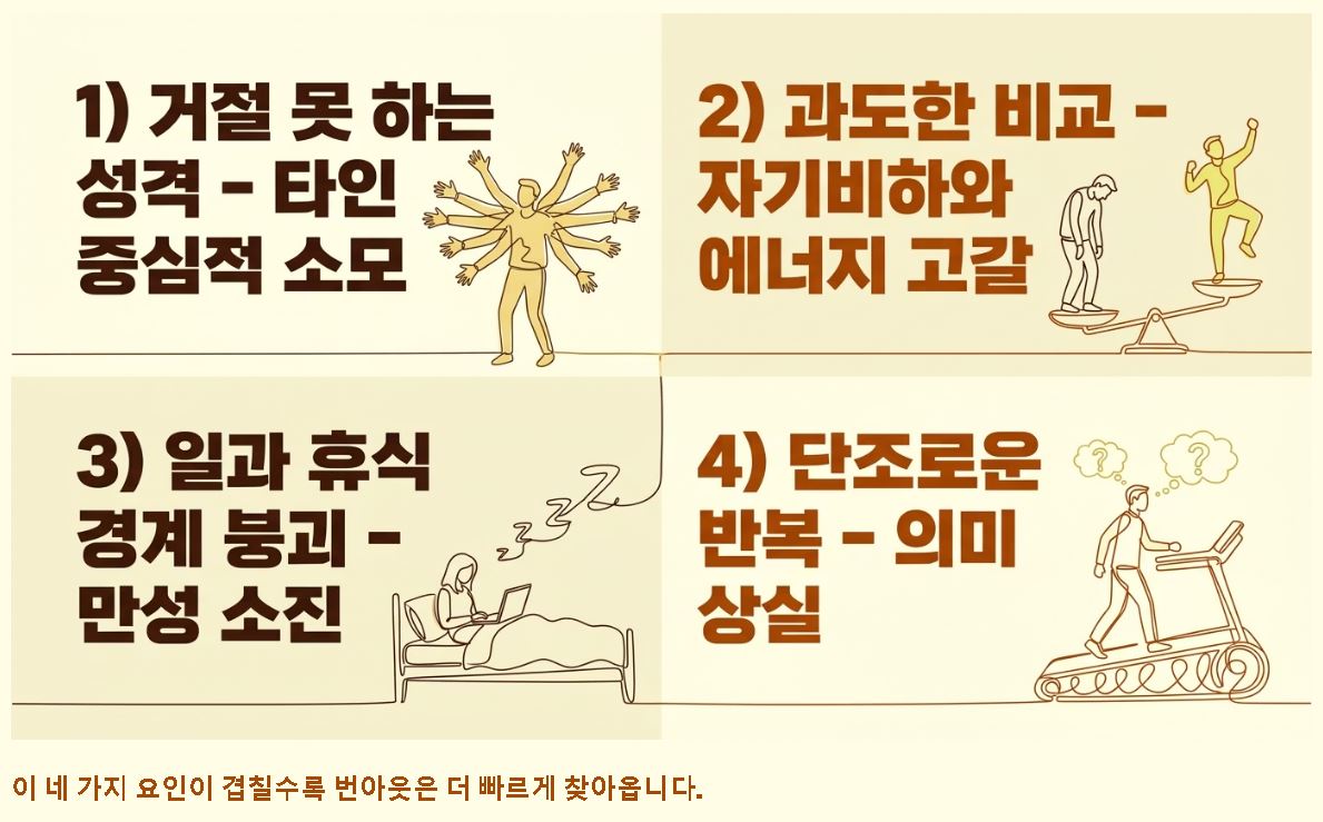 요약: 번아웃은 거절하지 못하는 성격이나 과도한 비교, 일과 휴식의 경계가 무너진 환경에서 더욱 가속화됩니다.