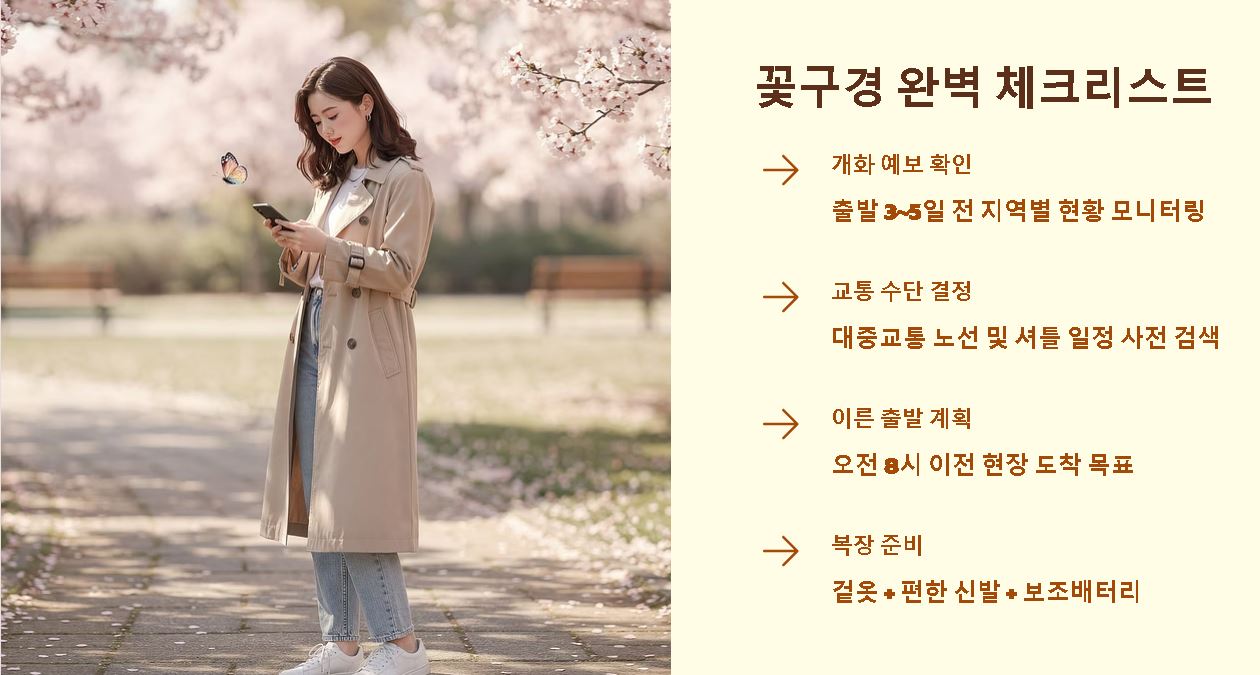 - 일교차 대비 복장: 봄볕은 따뜻하지만 아침저녁 바람이 차가우니 얇은 겉옷과 편한 운동화를 갖추는 것이 필수입니다.