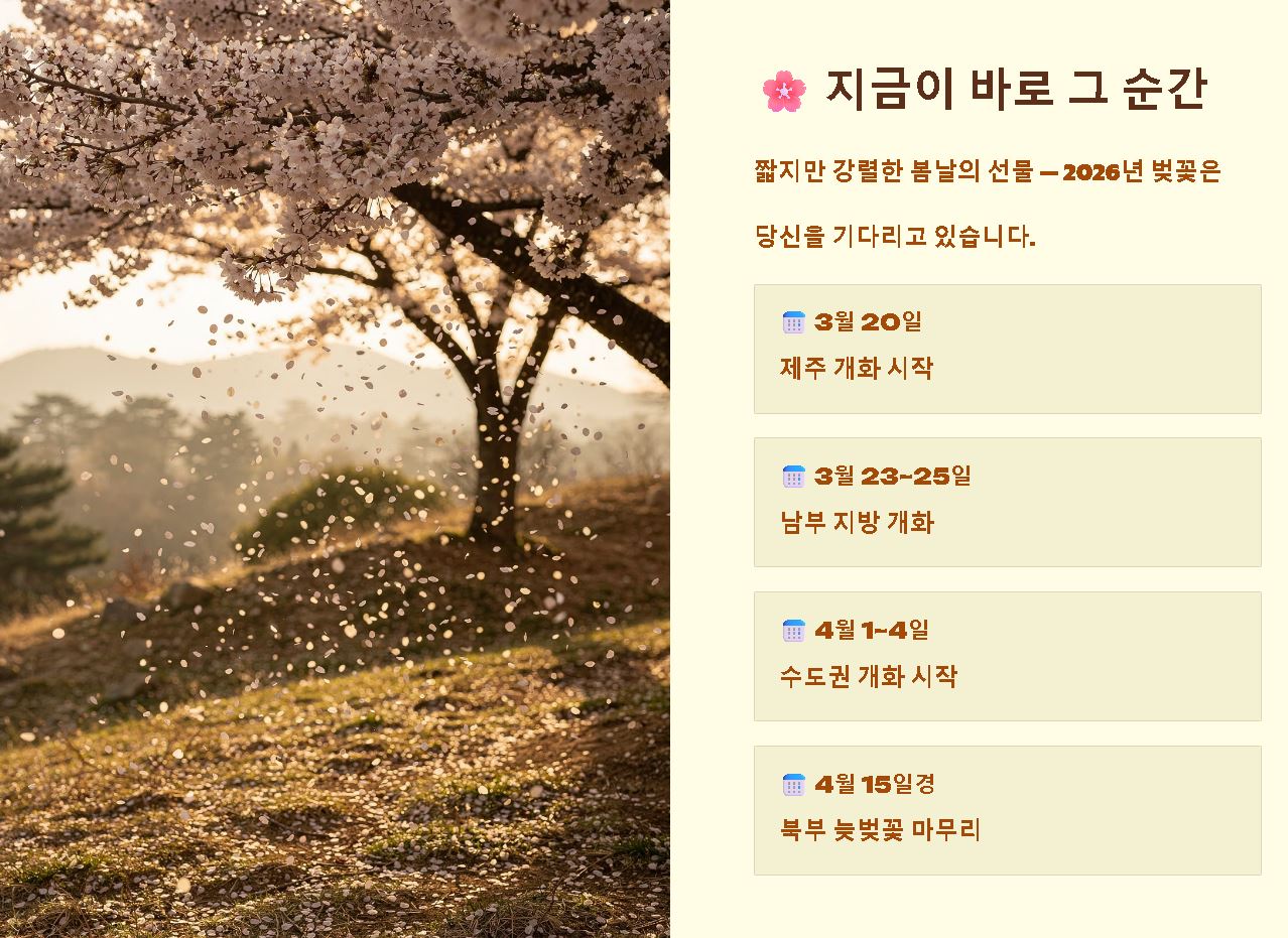 요약: 벚꽃 개화시기 2026 예상은 3월 하순 남부에서 시작해 4월 둘째 주 수도권 절정으로 이어집니다.