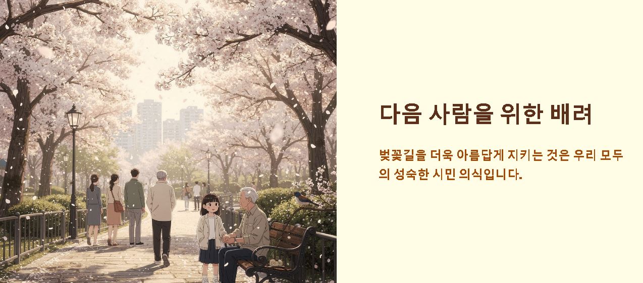 - 소음 주의: 주거지와 인접한 벚꽃길에서는 인근 주민들의 평온한 일상을 방해하지 않도록 정숙을 유지합니다.