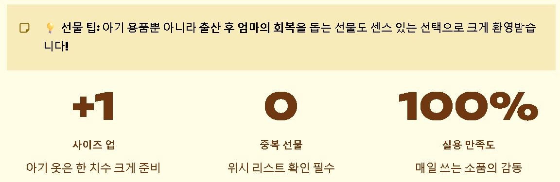 - 실용적 도움: 육아에 필요한 용품들을 선물로 받음으로써 경제적 부담을 덜어주는 역할을 합니다.