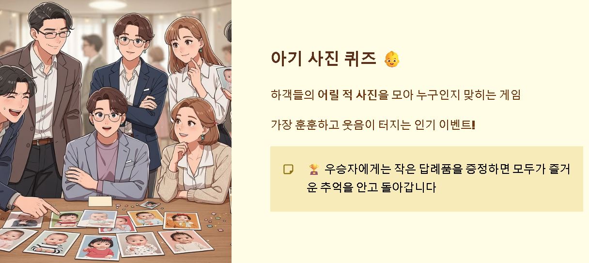 - 아기 사진 퀴즈: 하객들의 어릴 적 사진을 모아 누구인지 맞히는 게임은 훈훈한 웃음을 자아냅니다.