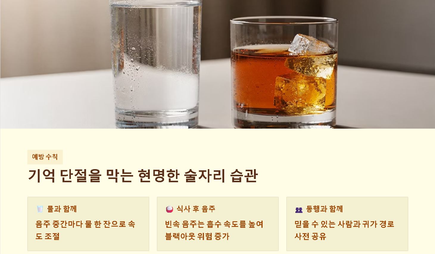 - Q: 술자리 기억 단절을 예방하는 생활 습관은? 빈속에 마시지 않고 물을 자주 섭취하며, 본인의 주량에 맞춰 대화 위주의 천천히 마시는 문화를 만드는 것이 중요합니다.