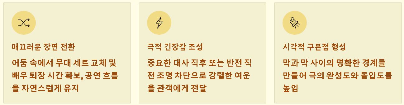 - 극적 긴장감 조성: 중요한 대사 직후나 반전이 일어나기 전 조명을 차단하여 관객에게 강렬한 여운을 남기는 수단으로 쓰입니다.