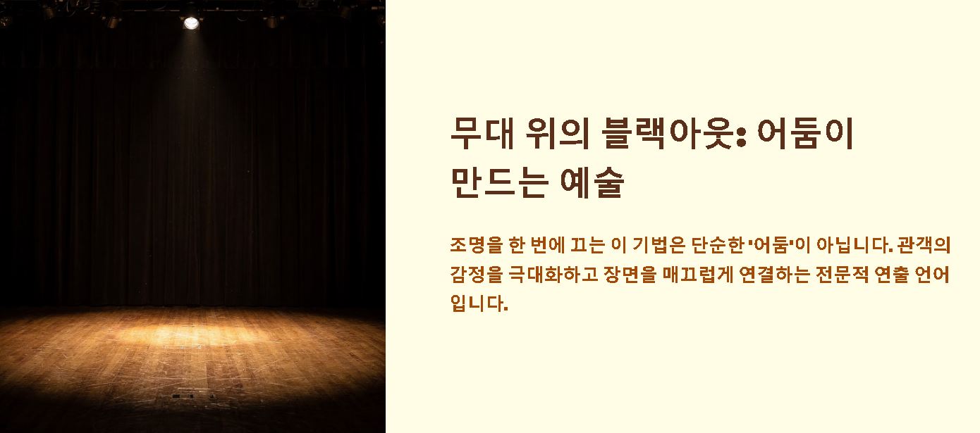 - 매끄러운 장면 전환: 어둠을 활용해 무대 세트를 교체하거나 배우가 퇴장하는 시간을 확보하여 공연의 흐름을 자연스럽게 이어줍니다.