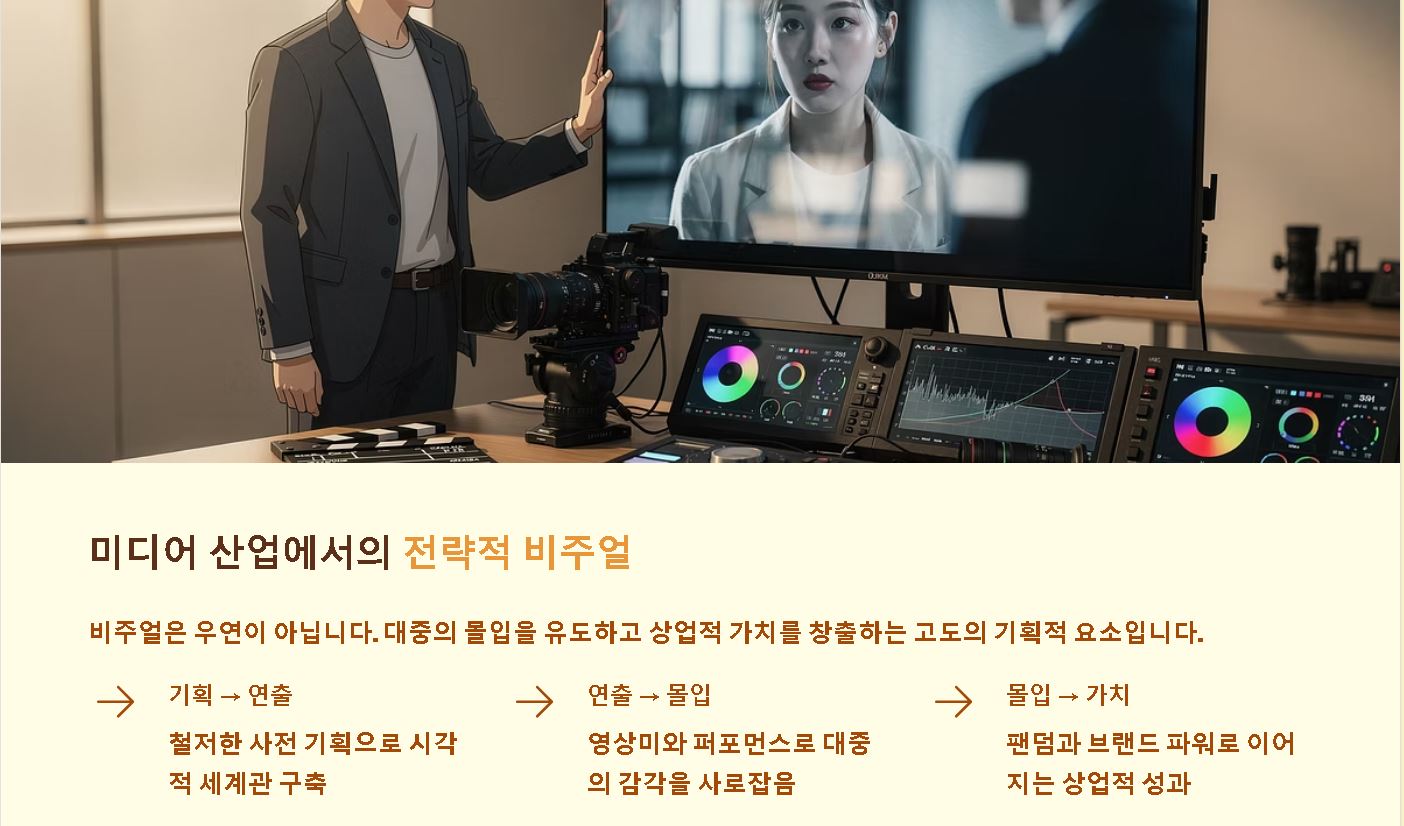 요약: 미디어 산업에서 비주얼은 대중의 몰입을 돕고 상업적 가치를 창출하는 고도의 기획적 요소로 활용됩니다.
