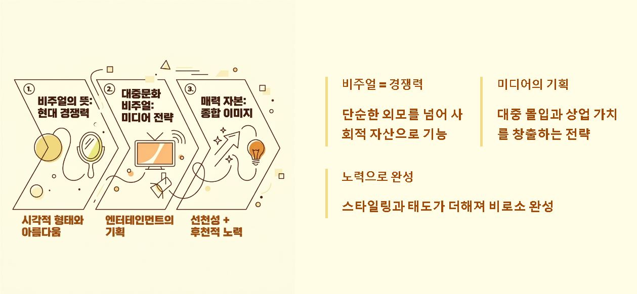 요약: 비주얼은 타고난 외모뿐만 아니라 후천적인 노력과 매너가 결합되어 완성되는 종합적인 이미지의 결과물입니다.