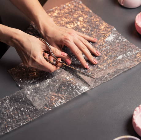 2) 창문 크기에 맞춰 뽁뽁이를 재단합니다. 이때 기포가 창 쪽을 향하도록 방향을 미리 확인하세요.