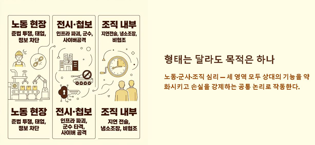 요약: 현대 노동 현장에서의 사보타주는 직접적 파괴보다는 준법 투쟁이나 의도적 태업 등 생산 효율을 떨어뜨리는 지능적 투쟁으로 나타납니다.