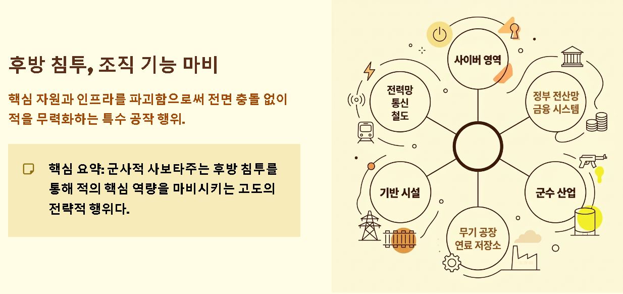요약: 군사적 사보타주는 후방 침투를 통해 적의 핵심 자원과 인프라를 파괴함으로써 조직의 기능을 마비시키는 특수 공작 행위를 의미합니다.