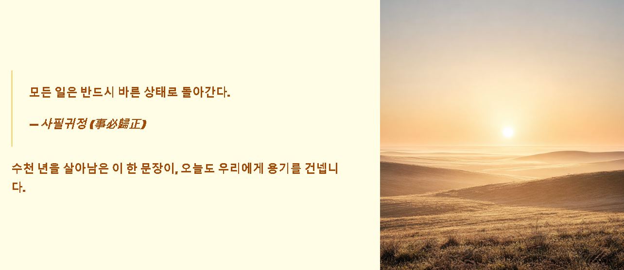 살다 보면 억울한 일을 겪거나 정의가 무너지는 순간을 목격하기도 하지만, 결국 시간이 흐르면 모든 일은 올바른 길로 돌아오기 마련입니다. 사필귀정 뜻은 바로 이러한 우주의 섭리와 공정함을 상징하는 고사성어인데요. 오늘은 현대 사회에서도 여전히 강력한 울림을 주는 사필귀정의 본질과 유사 용어들과의 차이점을 상세히 파악해 보시기 바랍니다.