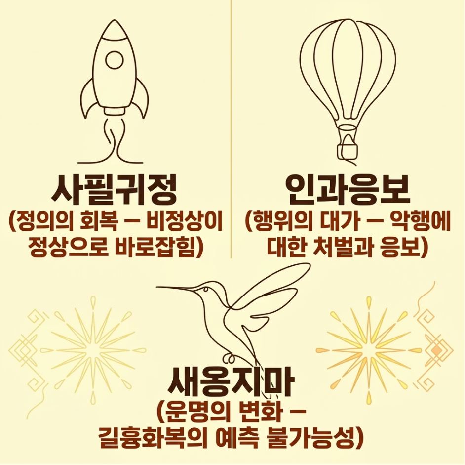 요약: 인과응보가 행위의 대가를, 새옹지마가 운의 변화를 말한다면 사필귀정은 정의의 회복을 선언하는 개념입니다.