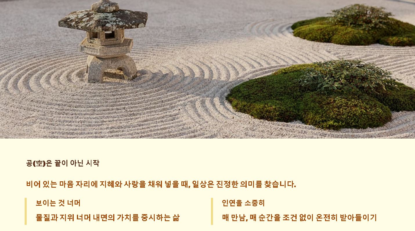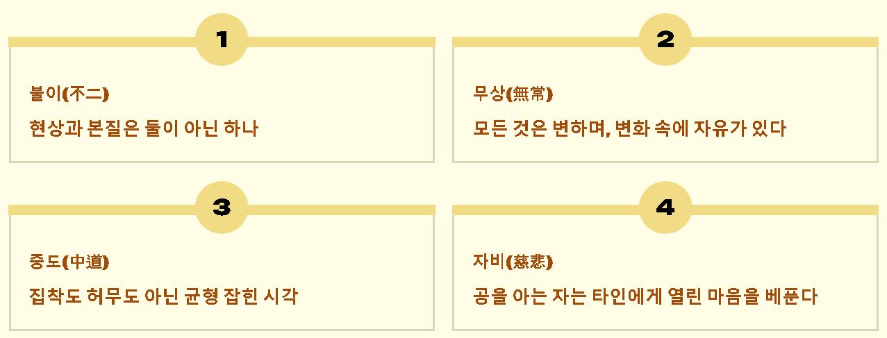 - 공(空): 빌 공 자로, 모든 존재는 인연에 따라 잠시 나타날 뿐 영원불변한 실체가 없음을 뜻합니다.