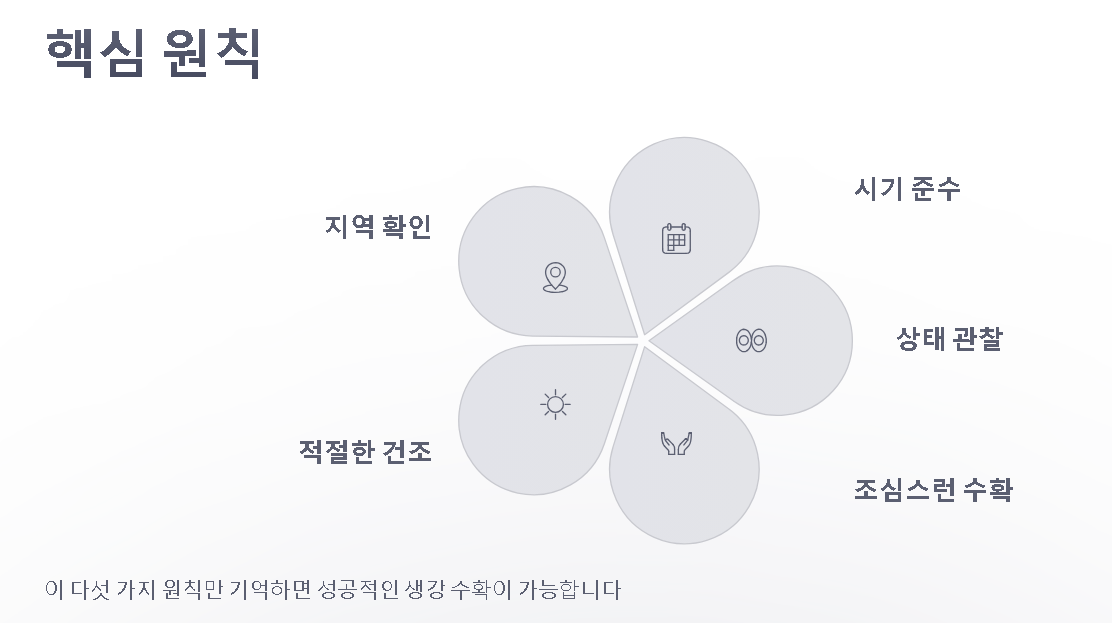 이 원칙만 기억하면 지역에 따라 생강 수확 시기를 정확히 판단해 더 좋은 품질로 보관하고 활용할 수 있습니다.