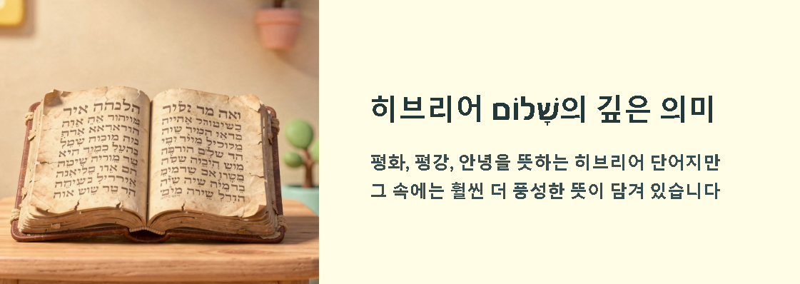 우리가 흔히 아는 '샬롬(Shalom)'은 히브리어로 평화, 평강, 안녕을 의미합니다. 하지만 이는 전쟁이 없는 상태만을 뜻하는 소극적인 평화가 아니라, 정신적, 육체적, 물질적으로 부족함 없이 온전하고 충만한 상태를 뜻하는 아주 포괄적이고 깊은 단어예요.
