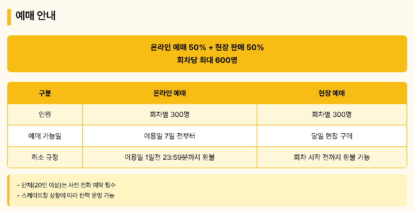 예매 자체는 어렵지 않지만, 예매 가능한 시점과 인원 배분이 다르기 때문에 먼저 구조를 이해하면 실수가 줄어듭니다. 서울광장 스케이트장은 온라인 예매 50퍼센트, 현장 판매 50퍼센트 방식으로 운영됩니다.