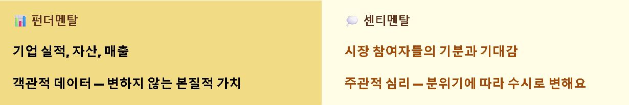 - 센티멘탈: 시장 참여자들의 기분이나 기대감을 뜻해요. 실적은 좋은데(펀더멘탈) 분위기가 안 좋아서(센티멘탈) 주가가 못 오르는 상황이 발생하는 이유예요.