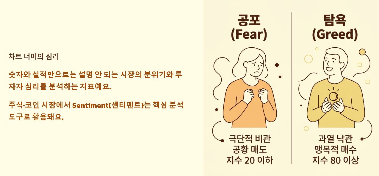 - 공포와 탐욕 지수: 시장이 센티멘탈해지면 작은 악재에도 패닉 셀(Panic Sell)이 나오거나, 근거 없는 호재에 맹목적으로 추격 매수하는 현상이 벌어져요.