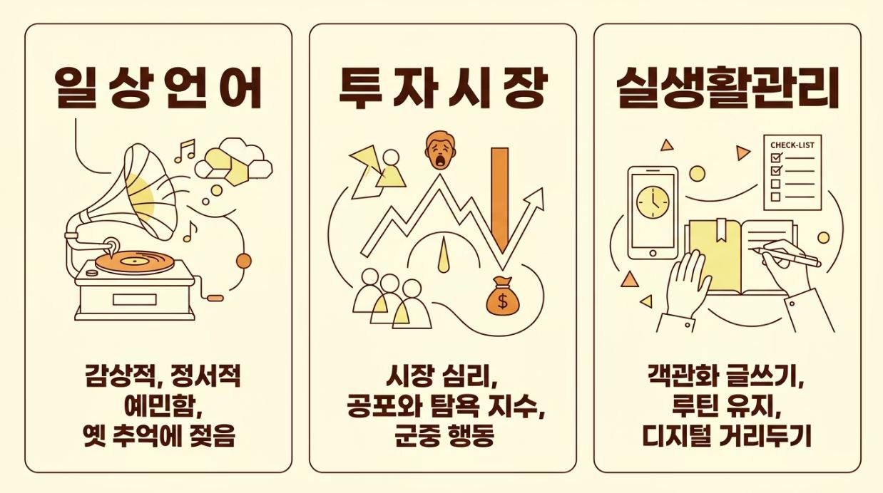 - 객관화 시키기: 너무 우울하거나 감상적일 때는 현재 내가 느끼는 감정을 글로 적어보세요. 감정을 밖으로 끄집어내면 뇌는 이를 객관적인 정보로 인식해서 차분해지기 시작해요.