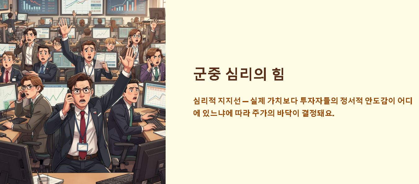 - 심리적 지지선: 실제 가치보다 투자자들의 정서적 안도감이 어디에 있느냐에 따라 주가의 바닥이 결정되기도 하는 등 심리의 영향력은 막강해요.