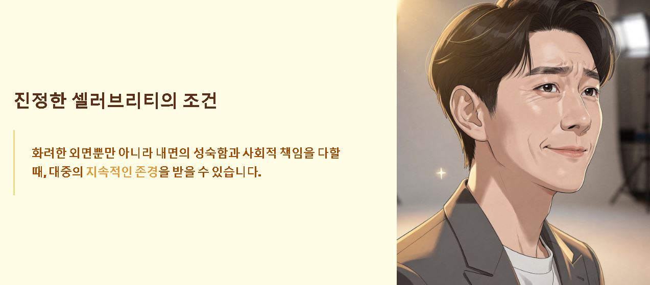 - 지나친 사생활 침해와의 투쟁: 유명세의 대가로 사생활이 노출되는 고통을 겪기도 하며, 무분별한 억측과 악성 댓글로부터 스스로의 정신 건강을 지키는 내면의 단단함이 요구됩니다.