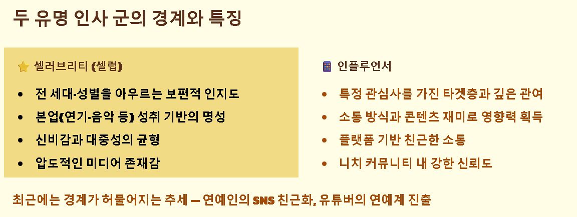 - 이미지 관리 전략의 변화: 최근에는 유명 연예인들도 SNS를 통해 인플루언서처럼 친근하게 다가가는 추세이며, 반대로 영향력 있는 유튜버가 정식 연예계로 진출하며 경계가 허물어지고 있습니다.