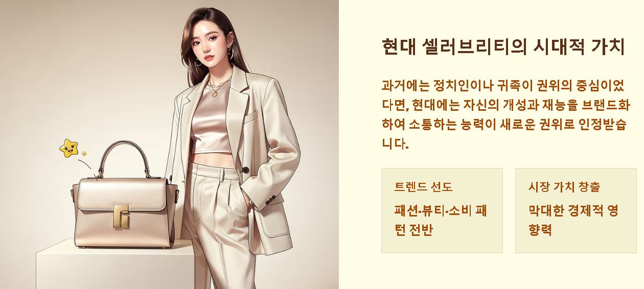 과거에는 정치인이나 귀족이 권위의 중심이었다면, 현대 사회에서는 연예인, 스포츠 스타, 기업인 등이 그 자리를 대신하고 있습니다. 자신의 개성과 재능을 브랜드화하여 소통하는 능력이 시대적 가치로 인정받기 때문인데요. 셀러브리티는 트렌드를 선도하는 아이콘으로서 패션, 뷰티, 소비 패턴 전반에 막대한 시장 가치를 창출합니다.