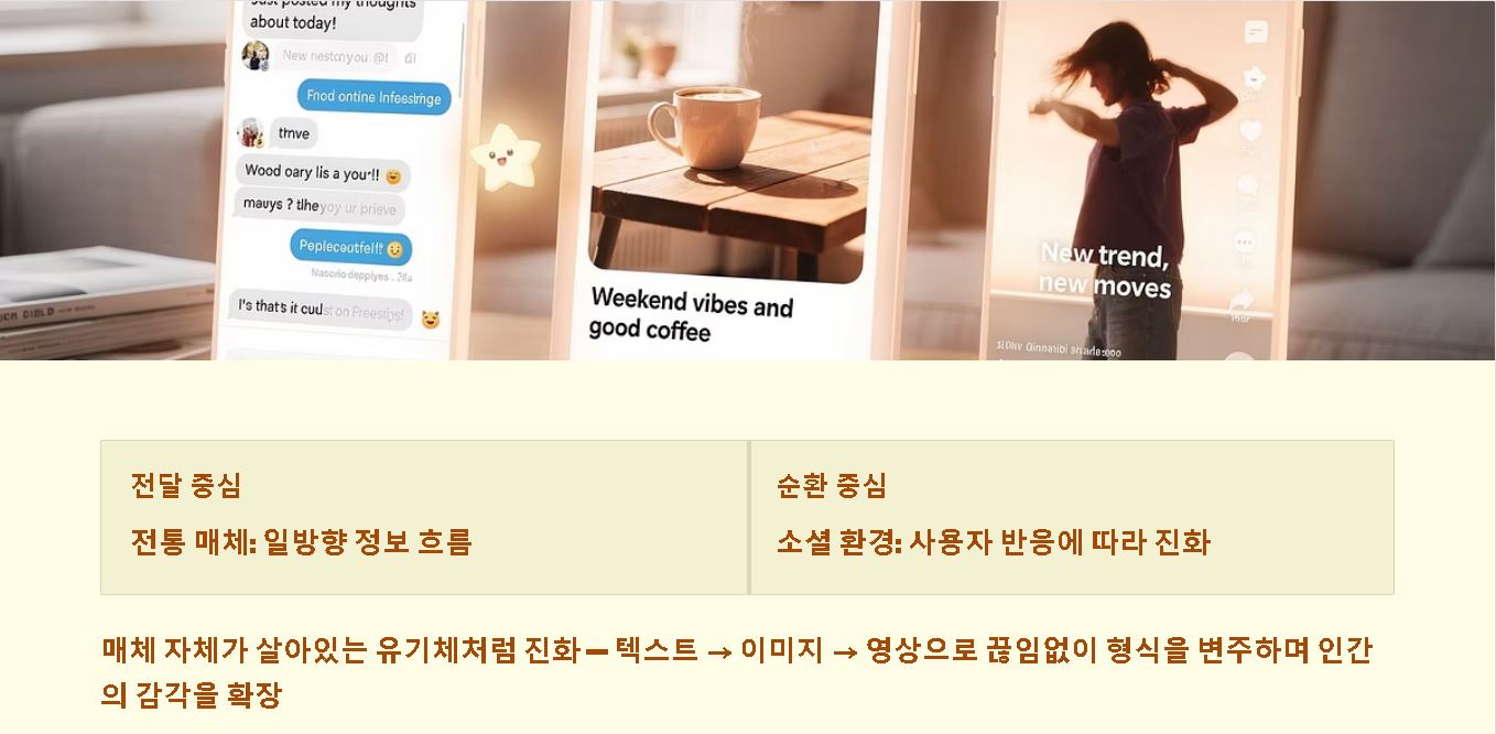 이러한 변화를 이해하려면 정보를 담는 그릇인 미디어 뜻을 다시 정의해야 합니다. 전통적인 매체가 '전달'에 집중했다면, 소셜 환경은 '순환'에 집중하는데요. 매체 자체가 살아있는 유기체처럼 사용자의 반응에 따라 진화하는 것이 특징입니다. 소셜 미디어는 텍스트 위주의 트위터에서 이미지 중심의 인스타그램, 영상 중심의 틱톡으로 끊임없이 형식을 변주하며 인간의 감각을 확장하고 있습니다.