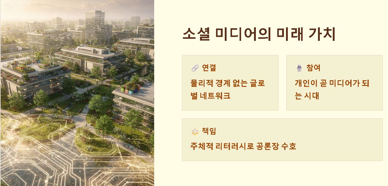 - Q: 소셜 미디어의 미래는 어떻게 변할까요? AI 개인 비서화, 메타버스와의 완전한 융합, 그리고 중앙 집중형 서버에서 벗어난 탈중앙화(Web 3.0) 매체들이 주류가 될 전망입니다.
