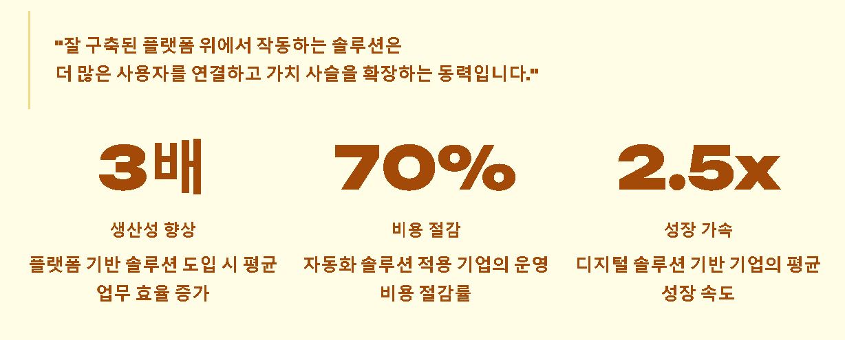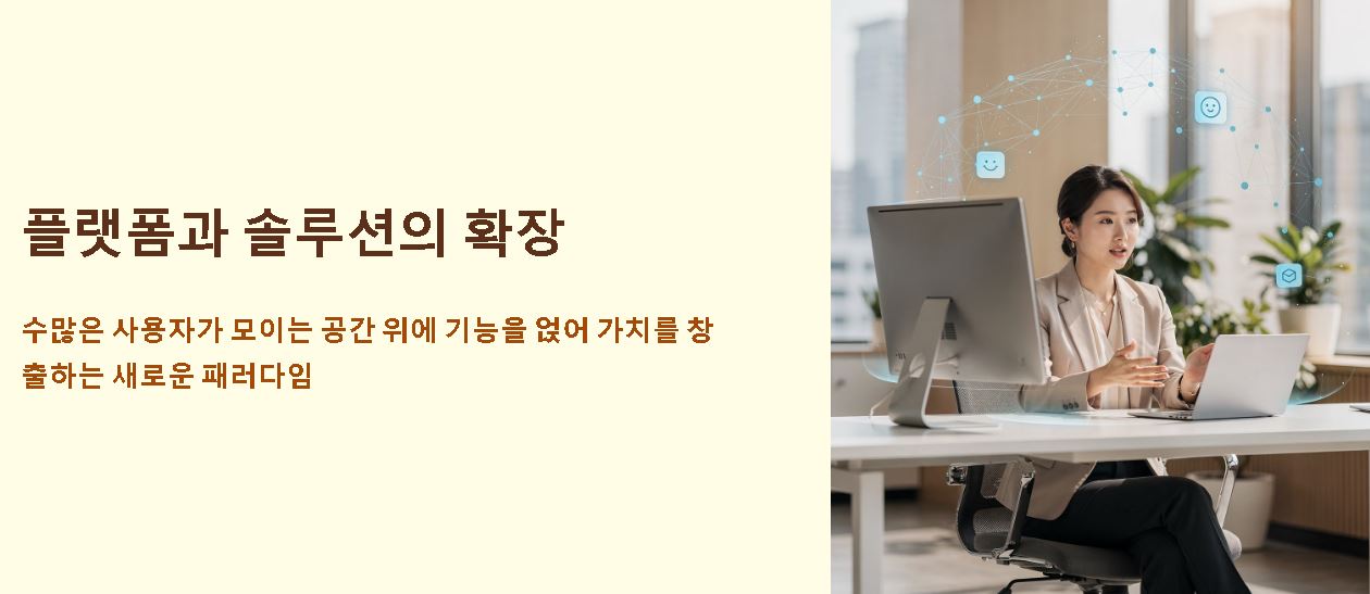최근에는 플랫폼이란 뜻처럼 많은 사용자가 모이는 공간 위에 다양한 기능을 얹어 가치를 창출하는 사례가 많습니다. 이곳에 필요한 고도화된 기능이나 편의 서비스들이 곧 하나의 솔루션으로 작동하게 되는 것인데요. 플랫폼의 확장성은 개별 기능들이 상호 연결되어 전체적인 생태계의 가치를 키우는 데 있습니다.