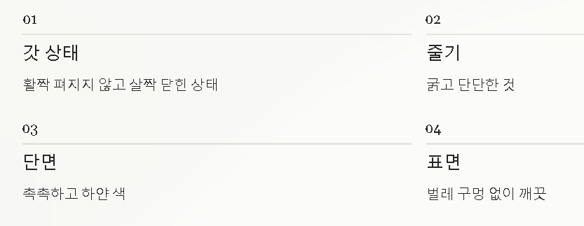 송이버섯은 품질에 따라 향과 식감이 확연히 달라집니다. 갓이 활짝 펴지지 않고 살짝 닫힌 상태가 가장 신선하며, 줄기가 굵고 단단한 것이 좋습니다. 단면이 촉촉하고 색이 하얀 버섯이 향이 강하고 씹는 맛도 탁월합니다.