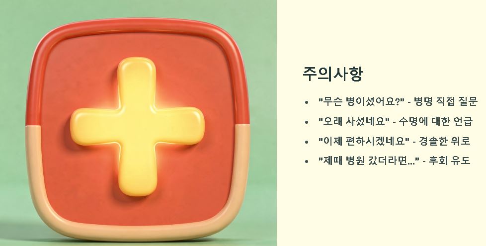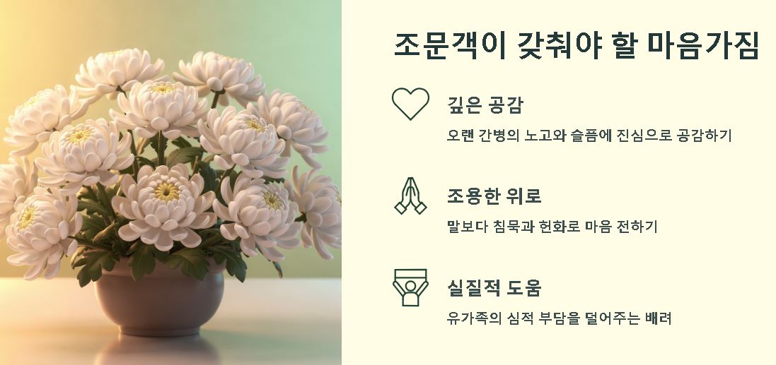 숙환으로 인한 별세 소식을 들었다면 유가족에게 오랜 간병의 노고를 위로하는 마음을 전하는 것이 중요한 위로의 지표입니다. 집안 정리를 도와주며 서로의 짐을 덜어주듯 고인의 고통이 멈췄음에 의미를 두며 조용히 헌화하는 모습은 장례식장에서의 비약적인 예의의 신호가 됩니다.