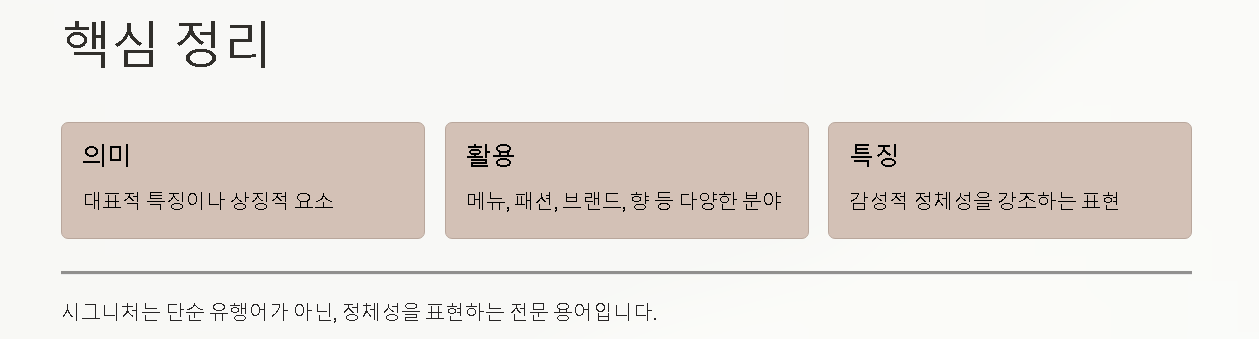 요약: 시그니처는 일상 표현으로 쉽게 활용되며 ‘대표적인 특징’을 말하는 데 적합합니다.