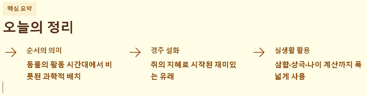 - 활동 시간대에 따른 배치: 실제로는 동물의 활동 시간과 밀접한 관련이 있어요. 쥐가 가장 활발한 밤 11시~새벽 1시가 자시(子時)이고, 소가 여물을 먹는 새벽 1~3시가 축시(丑時)인 식이에요.