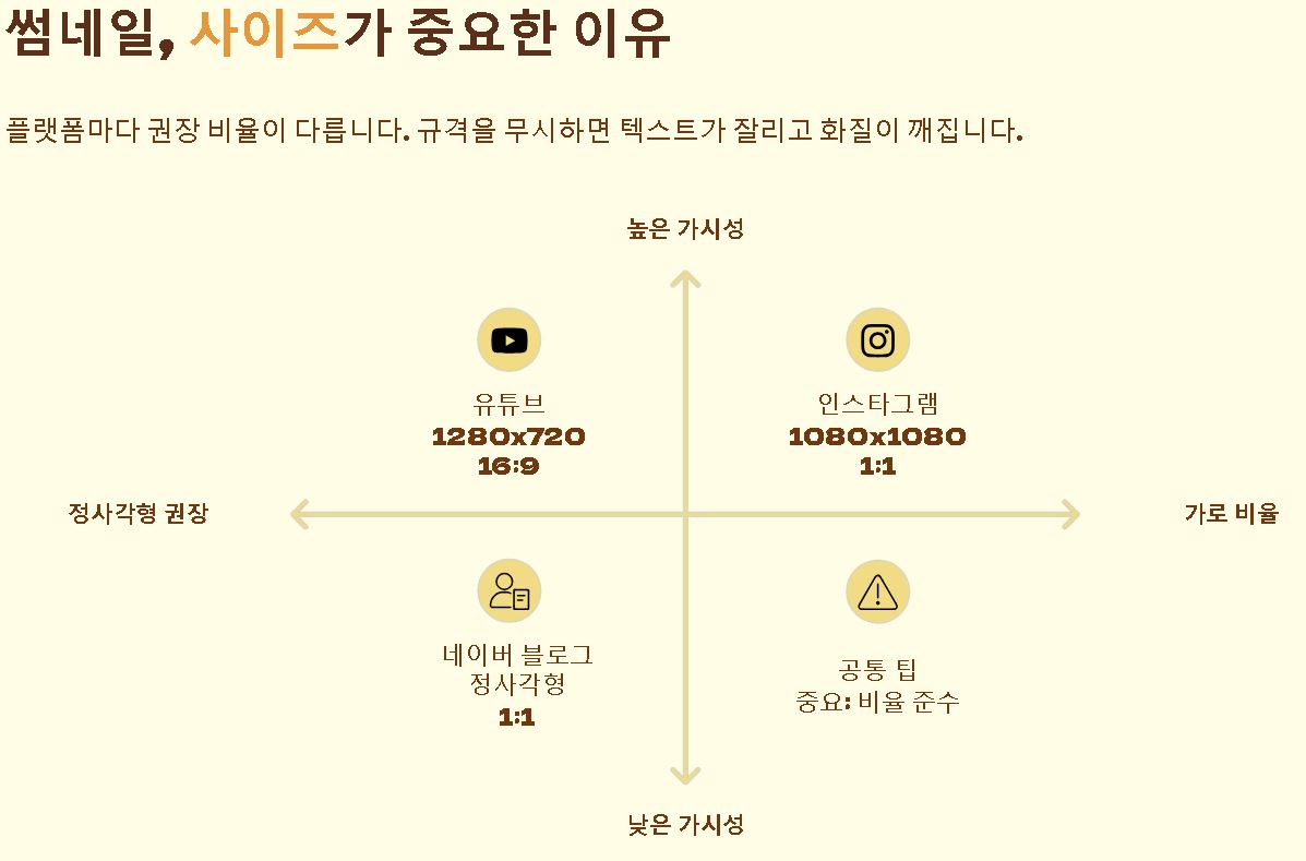 썸네일은 게시되는 환경에 따라 권장하는 비율과 사이즈가 다릅니다. 유튜브는 16:9 비율의 가로형을 선호하고, 인스타그램은 1:1 정사각형을 주로 사용하는데요. 플랫폼의 규격을 무시하고 제작하면 중요한 텍스트가 잘리거나 화질이 깨져 전문성이 떨어져 보일 수 있으니 사전에 규격을 맞추는 작업이 필수입니다.