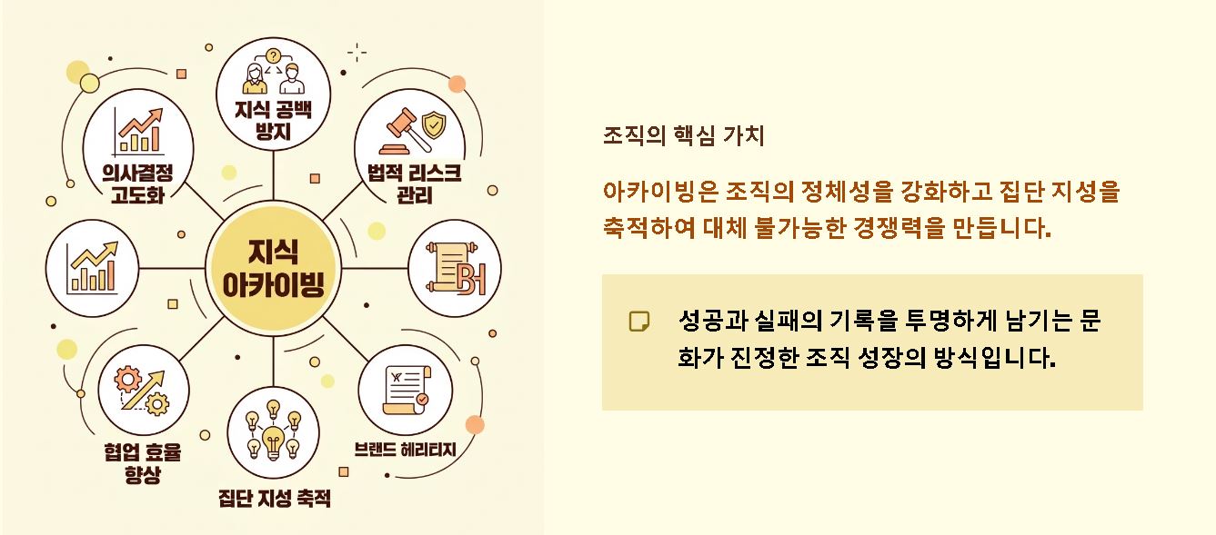 요약: 아카이빙은 조직의 정체성을 강화하고 집단 지성을 축적하여 대체 불가능한 경쟁력을 만듭니다.
